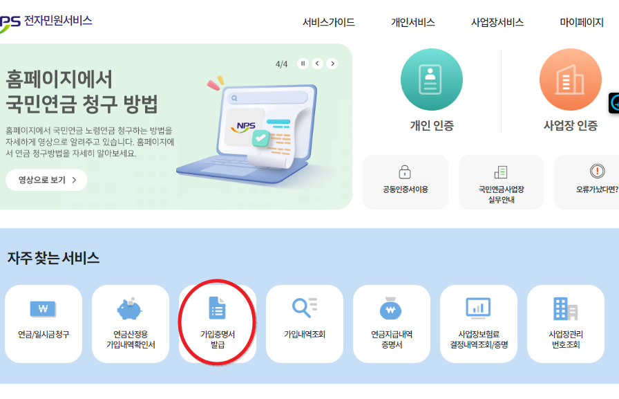 먼저, 경력증명서 온라인 발급 홈페이지에 접속하세요. 홈페이지에 접속한 후 로그인을 진행합니다. 로그인이 완료되면 '가입증명서 발급'을 선택하여 발급 절차를 시작합니다.