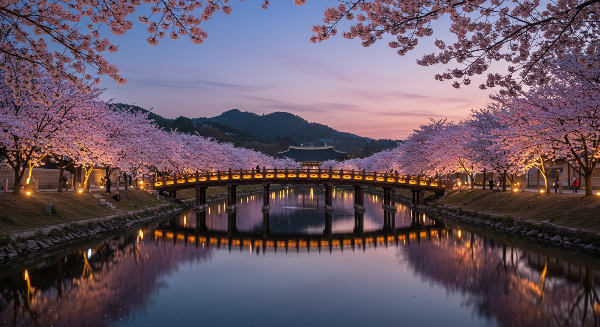 월정교의 벚꽃은 전통 한옥 다리와 어우러져 독특한 포토스팟을 제공합니다. 특히 월정교는 야간 조명이 특별히 아름답기로 유명하니, 꼭 야간에도 방문해보시기를 추천드립니다.