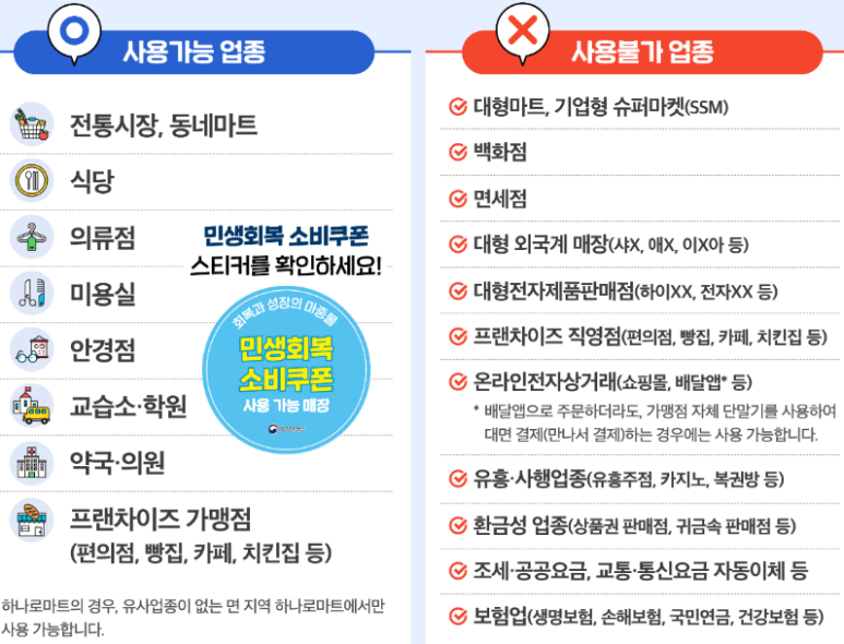 민생회복지원금은 소비 진작과 소상공인 중심의 내수 경기 회복에 초점을 두고 있기 때문에, 대형마트나 백화점, 면세점 등에서는 사용이 불가능합니다. 매장에 '민생회복 소비쿠폰 사용 가능 매장'이라는 스티커가 붙어 있다면 해당 매장에서 사용할 수 있으니 참고하세요.