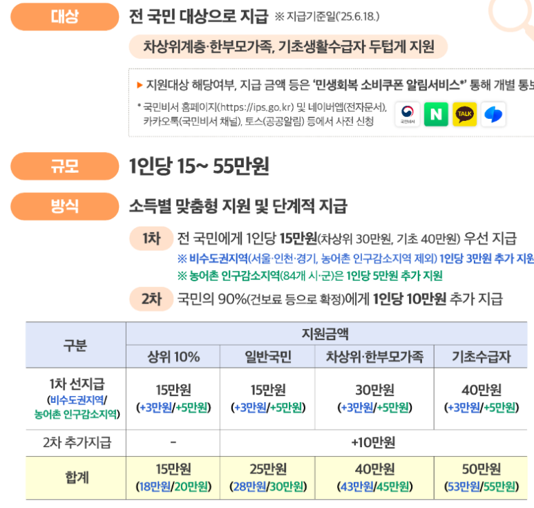 민생회복지원금은 기본 지원금과 추가 지원금으로 나뉩니다. 기본 지원금은 1인당 15~50만 원이 지급되며, 수도권을 제외한 지역 거주자에게는 3만 원, 인구 감소 지역 거주자에게는 5만 원이 추가 지급됩니다. 따라서 개인별로 적게는 15만 원부터 많게는 55만 원까지 받을 수 있습니다.