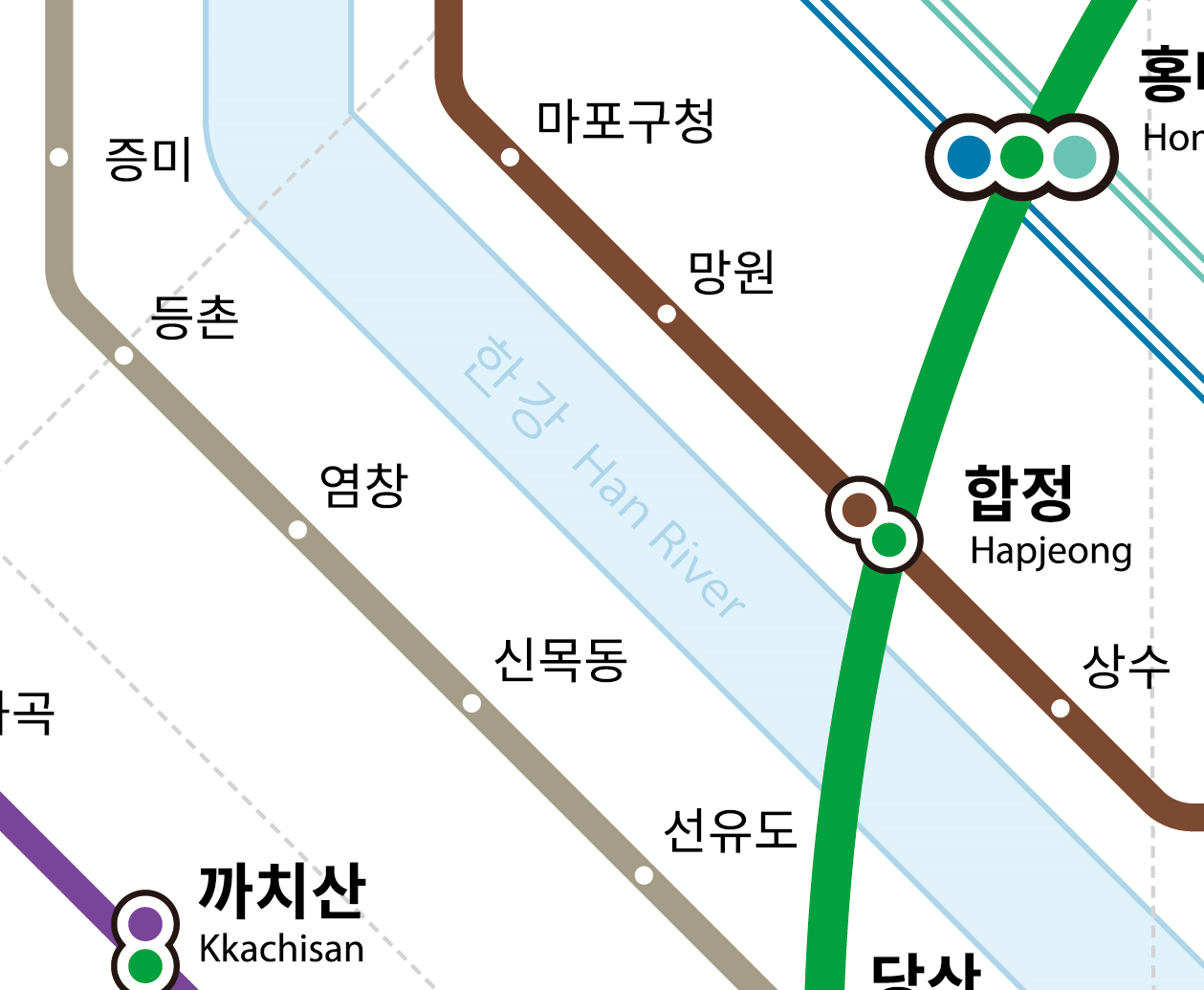 관광객에게 현 위치를 이해하는 것은 어려운 일입니다. 이를 돕기 위해 도심과 외곽 지역 경계선과 인천공항, 바다, 강 등 주요 지리 정보를 노선도에 표현하였습니다. 내년에는 랜드마크 아이콘을 노선도에 적용하여 서울의 명소도 홍보할 예정입니다.