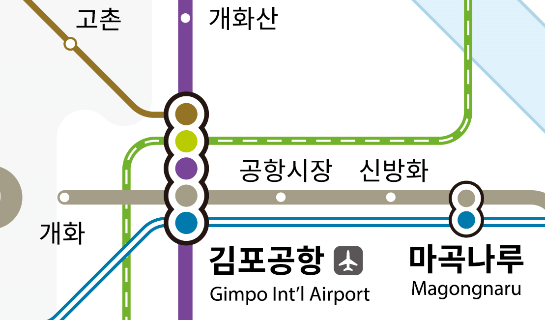 환승역 표시의 개선은 이용자가 쉽게 목적지를 따라갈 수 있도록 도와줍니다. 기존에는 일반역과 동일한 형태로 표기되었던 환승역이 신호등 방식으로 변경되어, 환승되는 노선의 색상을 나열하고 연결 고리 형식으로 표기하였습니다.