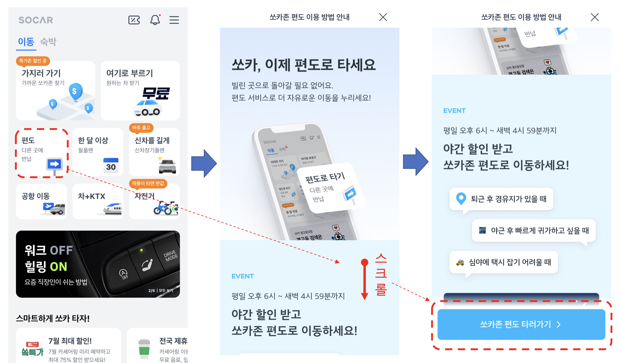 - 쏘카 앱의 '차량 열기' 기능으로 도어 열기