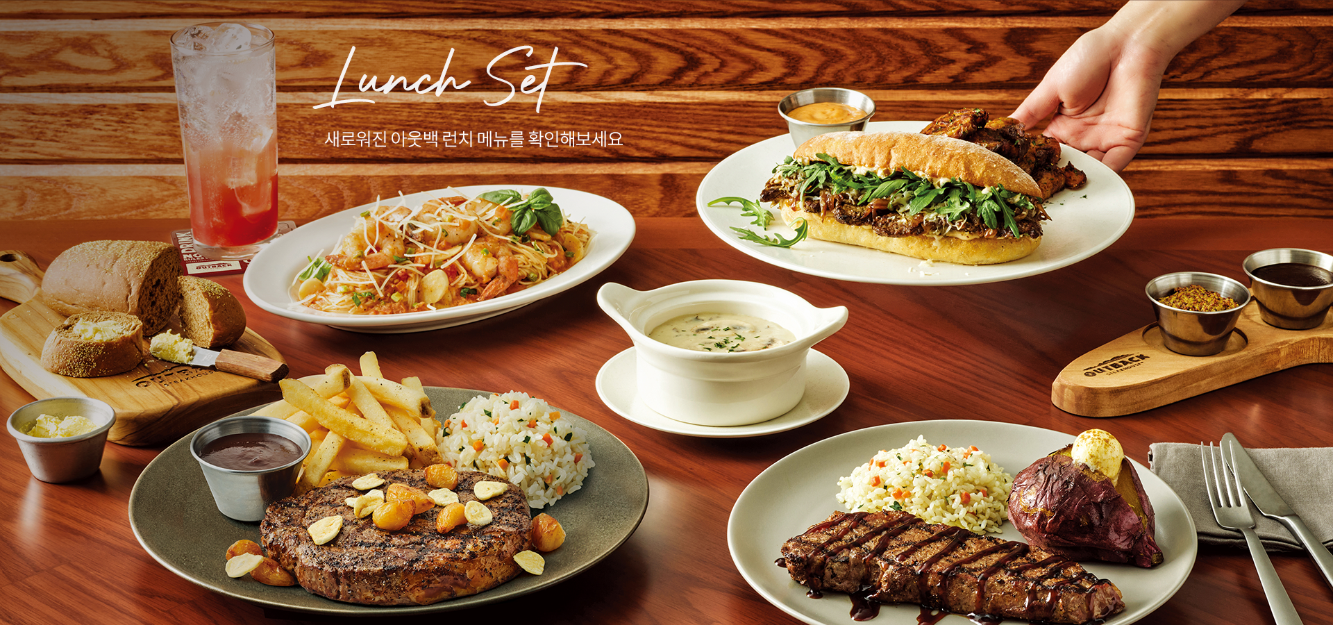 아웃백에서는 후식과 부쉬맨브레드 테이크아웃, 스테이크 단품 주문 시 1만원 할인 등이 가능합니다.