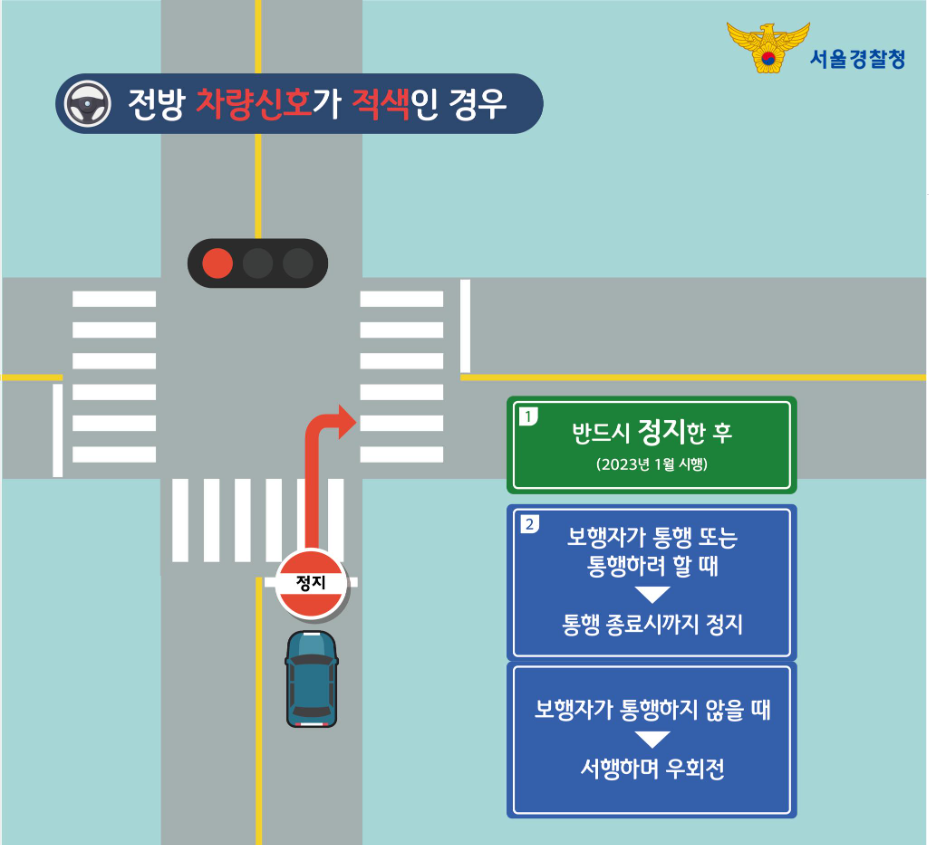 우회전 시 전방 차량신호를 반드시 확인해야 합니다. 적색 신호에서는 반드시 일시정지하여 보행자 유무를 확인한 후 출발해야 합니다.
