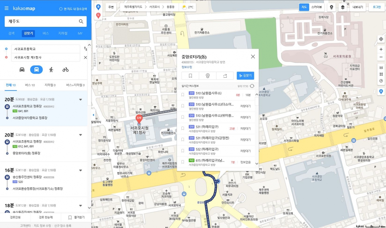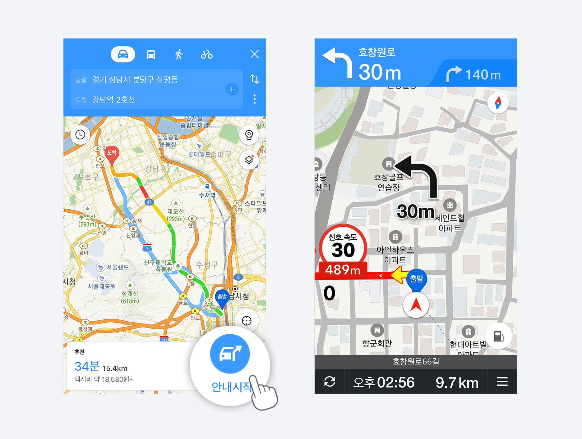 - 경로 선택: 자동차, 대중교통, 도보 등 다양한 경로 옵션을 확인하고 원하는 경로를 선택합니다.