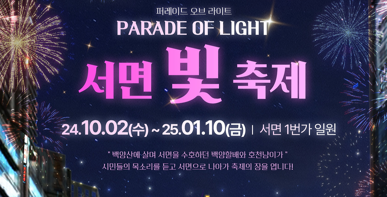 2024 부산 서면 빛 축제는 10월 2일부터 2025년 1월 10일까지 무려 101일간 진행됩니다. 서면 1번가 일원에서 펼쳐지는 이 축제는 화려한 일루미네이션과 다양한 빛 조형물로 겨울밤을 아름답게 수놓습니다. 특히 올해는 더욱 다채로운 프로그램과 이벤트가 준비되어 있어 방문객들에게 잊지 못할 추억을 선사할 것입니다.